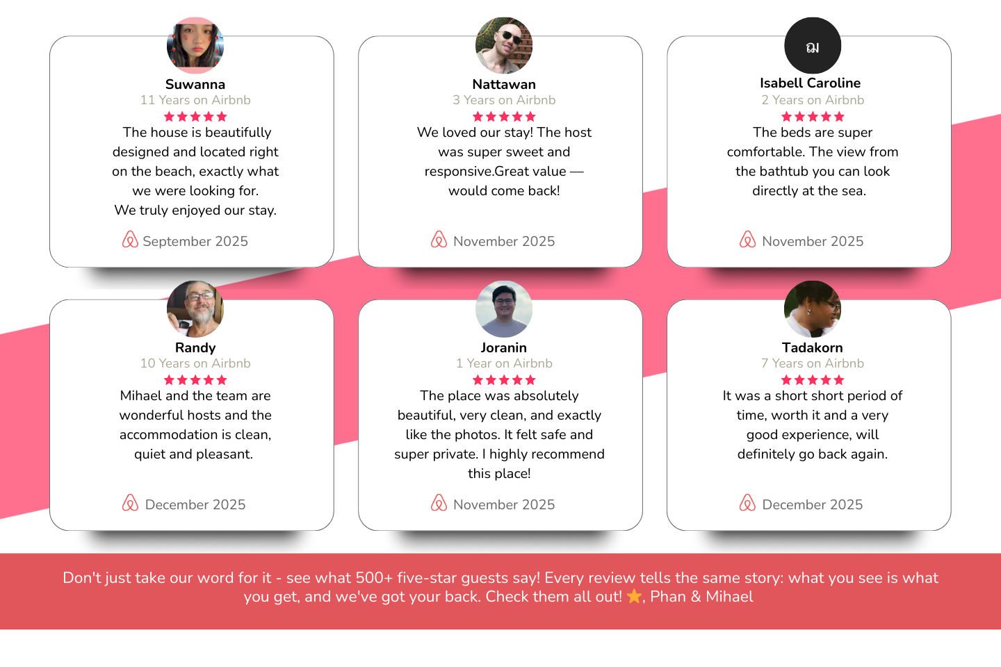 🌴 Private & Peaceful: The villa is very private and located away from the crowds — a true escape from busy Hua Hin. Please remember you’re staying in a residential area in a private property, not a hotel. 🦎 Tropical Setting: With the open garden and beachfront location, you may see small geckos or lizards — they’re harmless and part of Thai seaside life. 🦟 Mosquitos: As with all beach homes, mosquitos are common outdoors. We’ve installed mosquito window screens and provide repellents, sprays, and incense to help minimize them. ❄️ Keep Doors Closed: To enjoy cool air conditioning and keep out mosquitos or lizards, please keep doors shut when AC is on. 🤝 Respect the Community: Treat the space and neighbors with respect. If any problems arise, we’ll do our best to act quickly, though note there is no 24/7 staff on-site. 📜 Local Laws: In accordance with Thai law on short-term rentals, please direct any official queries to our cohost for prompt assistance.