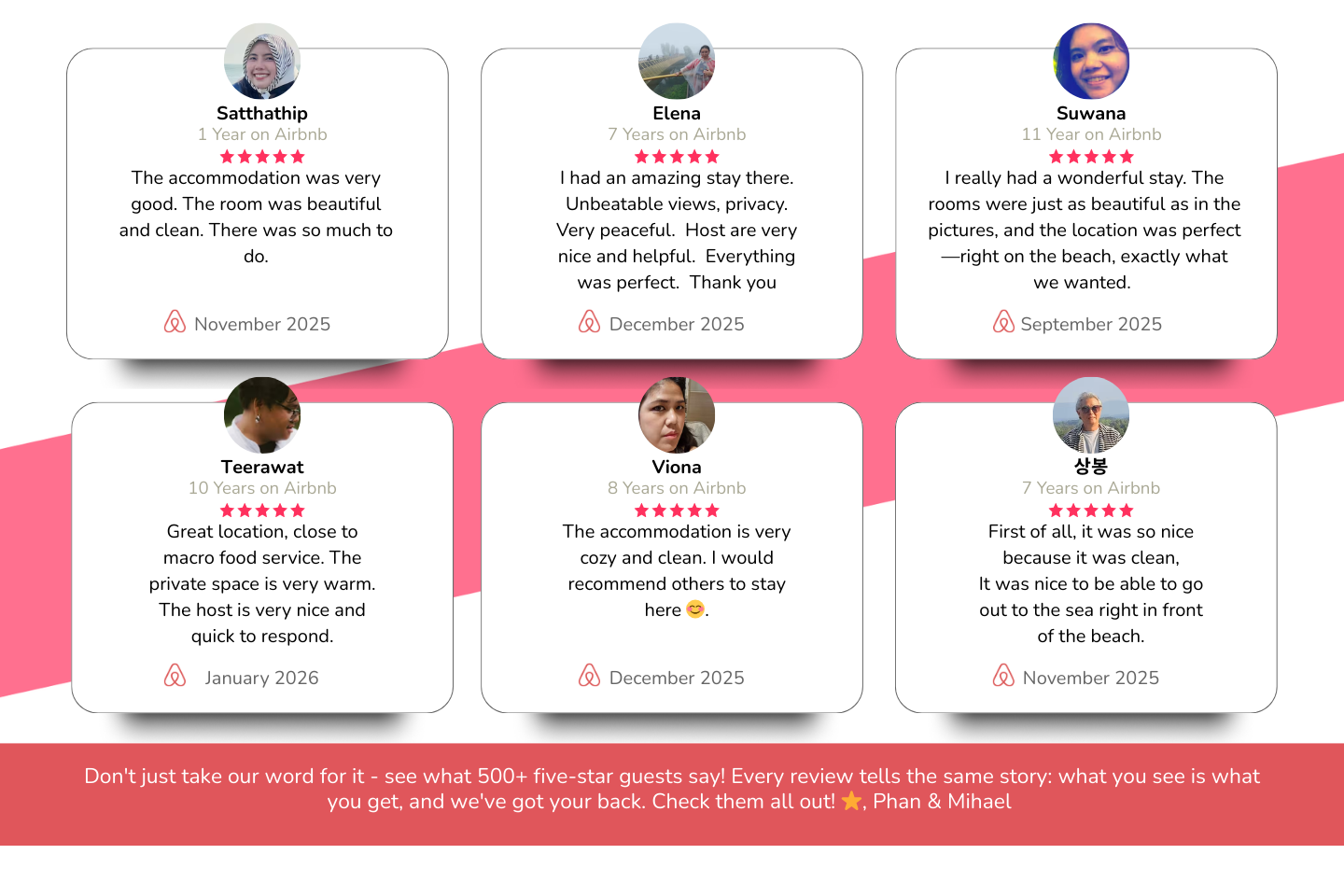 🌴 Private & Peaceful: The villa is very private and located away from the crowds — a true escape from busy Hua Hin. Please remember you’re staying in a residential area in a private property, not a hotel. 🦎 Tropical Setting: With the open garden and beachfront location, you may see small geckos or lizards — they’re harmless and part of Thai seaside life. 🦟 Mosquitos: As with all beach homes, mosquitos are common outdoors. We’ve installed mosquito window screens and provide repellents, sprays, and incense to help minimize them. ❄️ Keep Doors Closed: To enjoy cool air conditioning and keep out mosquitos or lizards, please keep doors shut when AC is on. 🤝 Respect the Community: Treat the space and neighbors with respect. If any problems arise, we’ll do our best to act quickly, though note there is no 24/7 staff on-site. 📜 Local Laws: In accordance with Thai law on short-term rentals, please direct any official queries to our cohost for prompt assistance. .